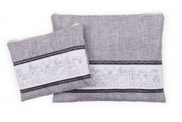 This fabric fully-lined Tallit and Tefillin Bag Set has been made in the Galilee Studio of Ronit Gur. It features a broad decorative stripe displaying embroidered Jerusalem images. Notice the Wall, the dome with a Star of David on its cupola and in the center – the famous iconic Montefiore Windmill built for the early Jewish settlers.