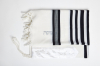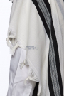 The tallit is white with black stripes, enhanced by an inner stripe pattern that incorporates a subtle black-and-white textured design, adding depth and visual interest. The atarah (neckpiece) is finished in shiny white fabric with a delicate floral motif, creating a refined contrast that gives this classic tallit a contemporary touch.